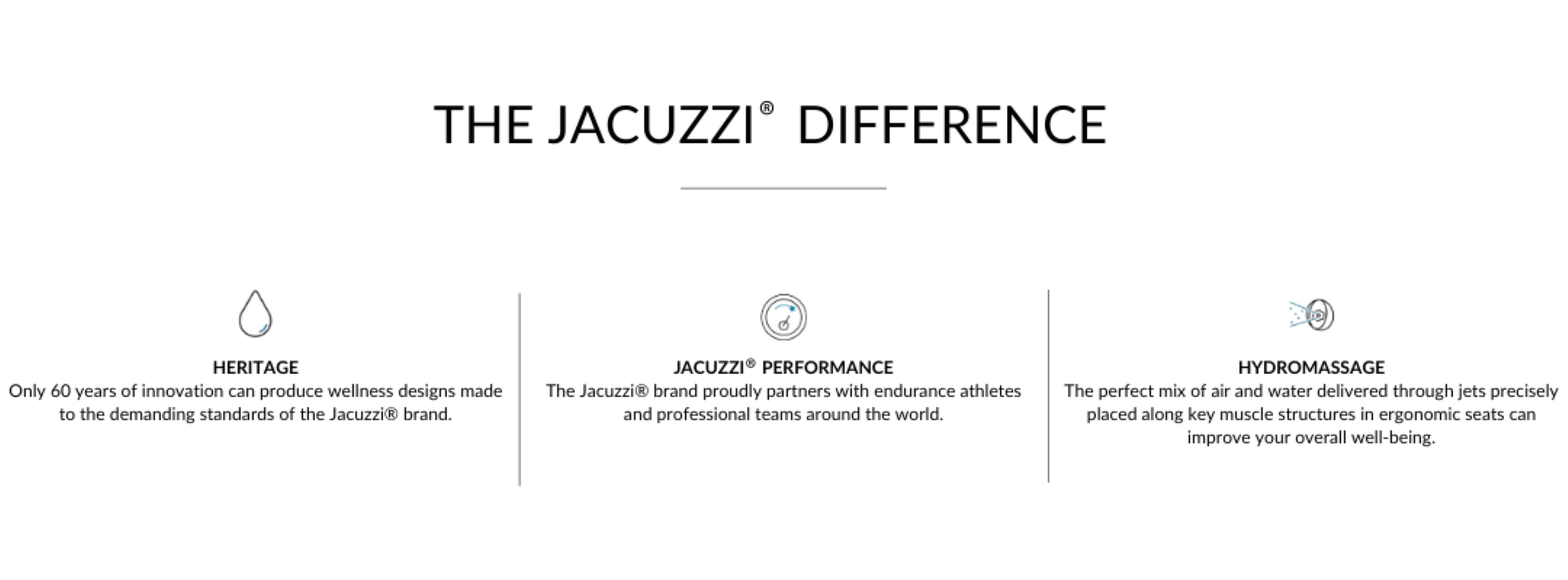 Hydromassage (Moving water for optimal massage): Jacuzzi® jet systems push high volumes of water uniquely mixed with air into a hydromassage bath. Gentle pressure on muscle tissue increases circulation. This stimulates blood flow, which can help muscles and joints recover from fatigue or injury and make it easier to move. The exclusive, patented TargetProTM jetting offers adjustable jet stream direction and intensity for a personalized massage experience.